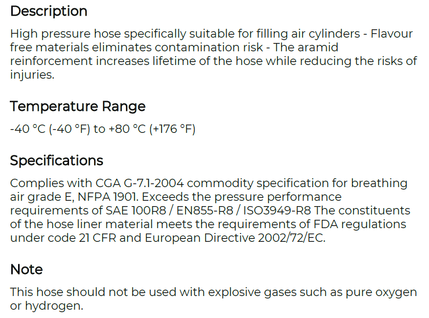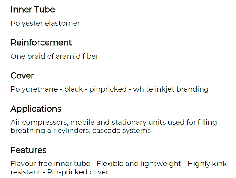 Constant pressure thermoplastic hose for air cylinder filling compressors up to 420 bar (6000 psi)